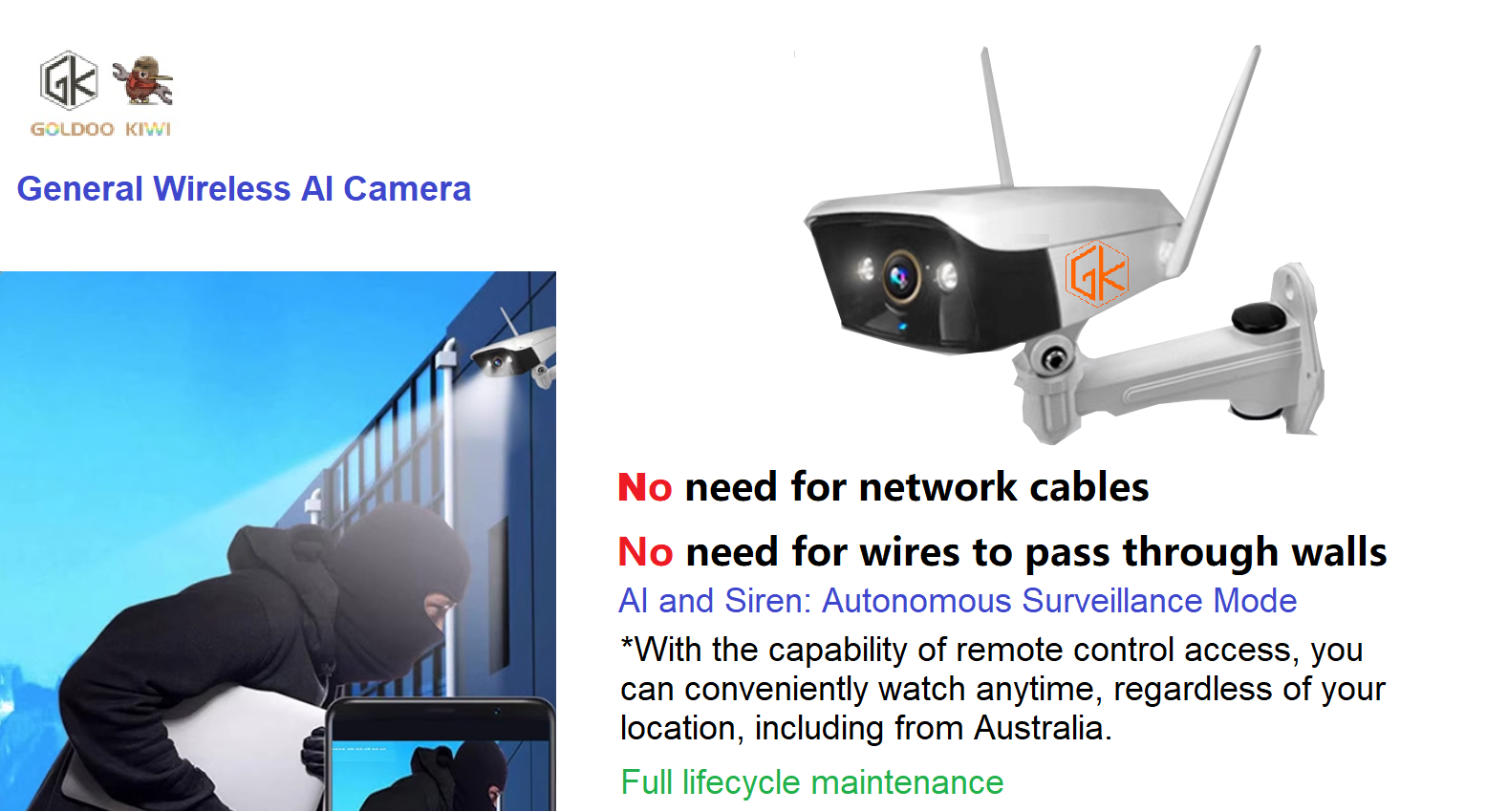 Product: The Goldoo Kiwi AI solution is available in two distinct versions: the general version and the solar version. Both versions are designed to operate wirelessly and include a siren alert feature. Furthermore, they are waterproof, with the solar version offering significantly enhanced capabilities compared to the general version.